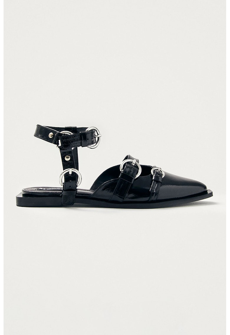Пантофки с каишка на глезена в елегантен черен цвят, изработени от висококачествена лачена кожа. Този модел е създаден за комфорт и стил в ежедневието, предоставяйки ви модерна визия и удобство през целия ден. Плоската подметка осигурява стабилност и лекота при ходене, което ги прави подходящи за дълги разходки или за работа. С остър връх, който придава изтънчен завършек, тези пантофки са перфектното допълнение към вашия гардероб, особено ако търсите комбинация от практичност и изискан дизайн. Закопчаването с катарама на глезена гарантира сигурност и перфектно прилепване, като същевременно добавя модерен акцент към обувката. Горната част е изработена от качествена лачена кожа, която придава блясък и издръжливост, а вътрешният материал е кожа, осигуряваща комфорт и дишане на кожата. Те са идеален избор за всеки, който цени стилна и практична обувка за ежедневно носене. Черният цвят ги прави лесни за съчетаване с различни облекла и стилове, подчертавайки вашата индивидуалност и вкус. Тези пантофки са чудесен избор за онези, които искат да изглеждат добре и да се чувстват удобно в същото време.