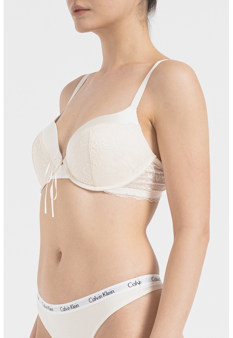 Сутиенът с повдигащ ефект и дантела в кремав цвят е перфектният избор за комфорт и стил под всякакви облекла. Изработен основно от полиамид с малък процент еластан, този сутиен предлага мекота и прилепналост, които осигуряват удобството, което търсите през целия ден. Безпринтовият дизайн подчертава изчистената му визия и е подходящ за носене както под фини, така и плътни материи.