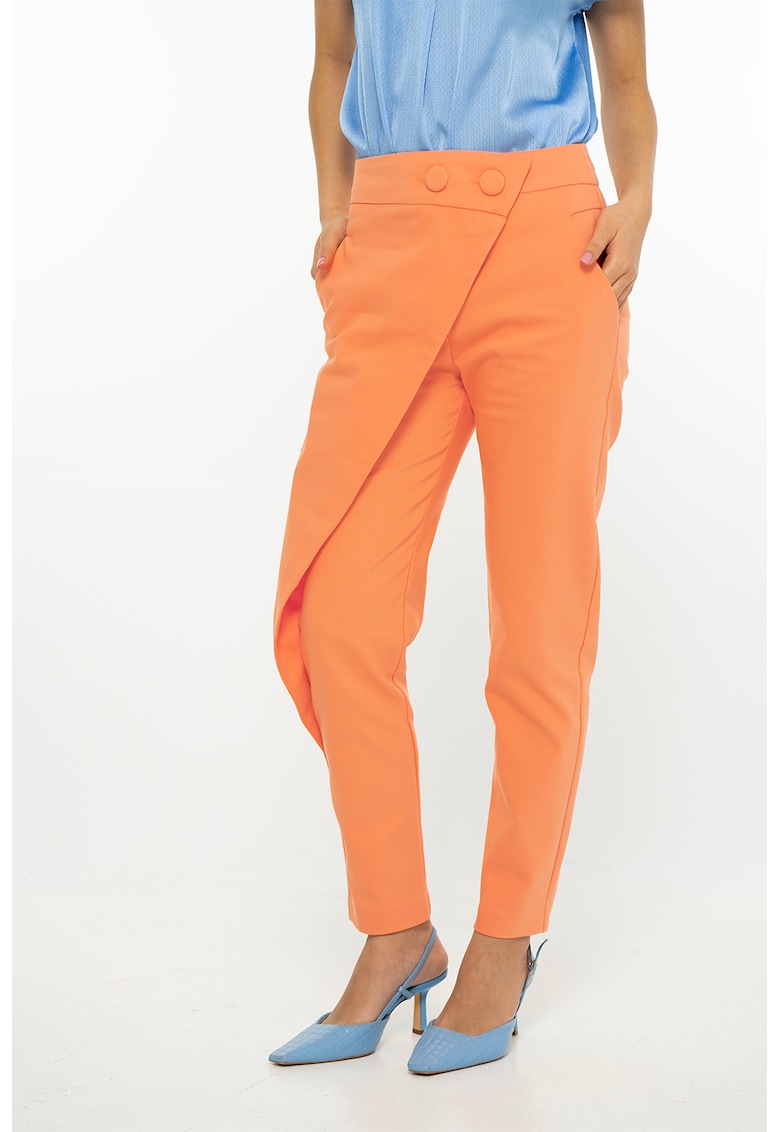 Скъсеният панталон Vanessa със застъпен дизайн в оранжев цвят е идеалният избор за елегантен и стилен летен тоалет. Изработен от висококачествена смес от памук, полиестер и еластан, този панталон гарантира комфорт и свобода на движение, благодарение на средновисоката талия и конусовидната кройка, която прилепва приятно към тялото и подчертава силуета. Дължината над глезена допринася за модерна визия, която може лесно да се комбинира с различни видове обувки – от елегантни сандали до спортни маратонки. Детайлният застъпен дизайн на предната част добавя изискан акцент, който прави панталона подходящ както за по-официални събития, така и за ежедневно носене.