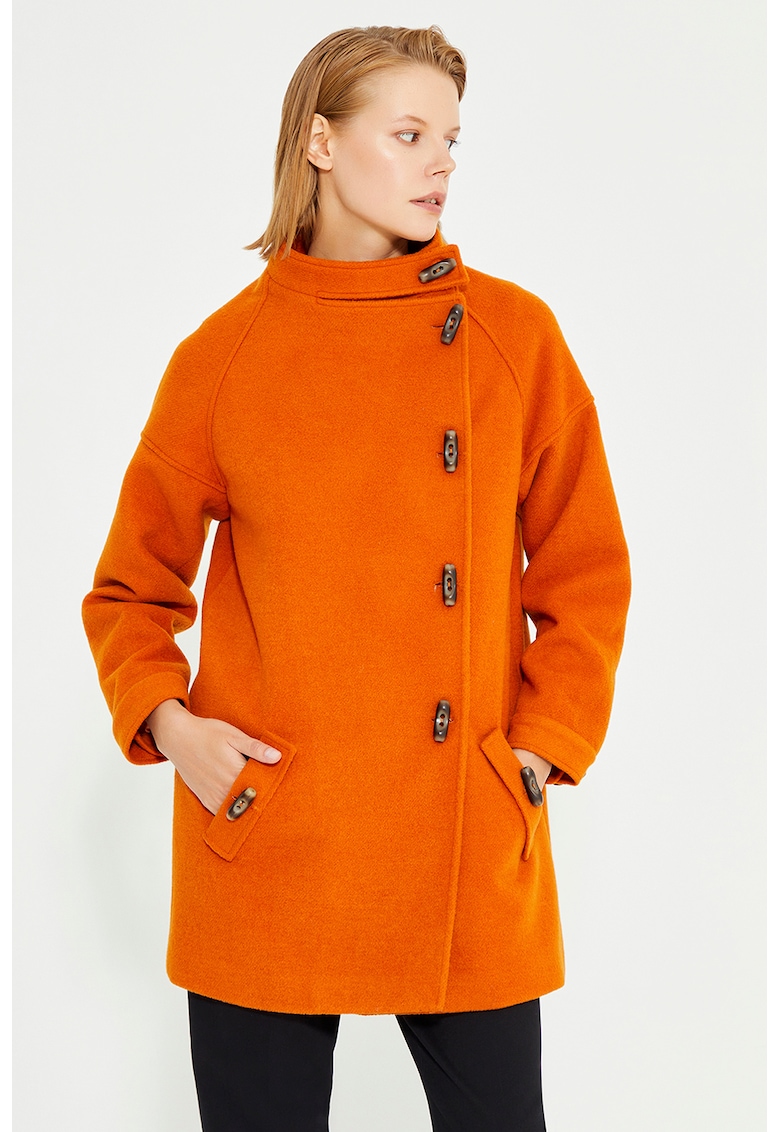 Палто с вълна с копчета в изгорен портокал е идеалният избор за всеки, който търси елегантно и стилно облекло за студените месеци. Съчетавайки класически силует с модерна цветова гама, това палто е изработено от висококачествен полиестер и вълна, което гарантира топлина и комфорт. Стандартната кройка осигурява удобство и свобода на движението, а средновисоката яка допълва елегантния вид, който може лесно да бъде съчетан както с официални, така и с ежедневни облекла. Свободнопадащите дълги ръкави придават допълнителен стил и улесняват носенето на палтото през целия ден. Палтото разполага с два практични джоба, които добавят удобство и функционалност без компромис с дизайна. Закопчаването с копчета е класическо и надеждно, подчертавайки традиционния стил на този модел. Яркият изгорен портокален цвят впечатлява с топлина и характер, като прави палтото забележително и подходящо както за ежедневни разходки, така и за специални поводи. Това палто е перфектен избор за всеки, който цени качеството, комфорта и стилната визия през студения сезон.
