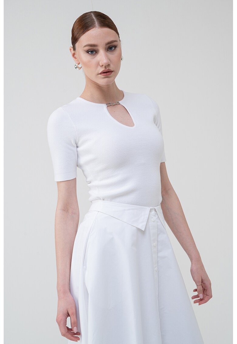 Изберете тази фино плетена тениска с метално лого, ако цените съчетанието между стил и функционалност. Бялото й излъчване е безвремено и лесно съвместимо с множество цветови гами, което превръща тази тениска в незаменима част от вашата колекция дрехи. Не пропускайте възможността да добавите качествен и визуално привлекателен артикул, който да ви служи дълго и да подчертава вашия индивидуален стил.