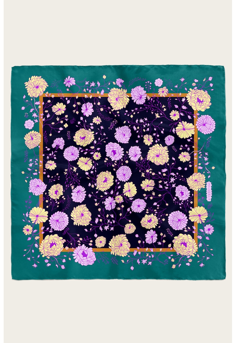 Флоралният принт в цветове лилав, персийско зелено и тъмносин добавя свеж и хармоничен вид, който лесно се съчетава както с ежедневни, така и с по-официални визии. Независимо дали търсите аксесоар за пролетно-лятото или есенно-зимния сезон, този копринен шал е отличен избор, който ще внесе цвят и елегантност в гардероба ви.
